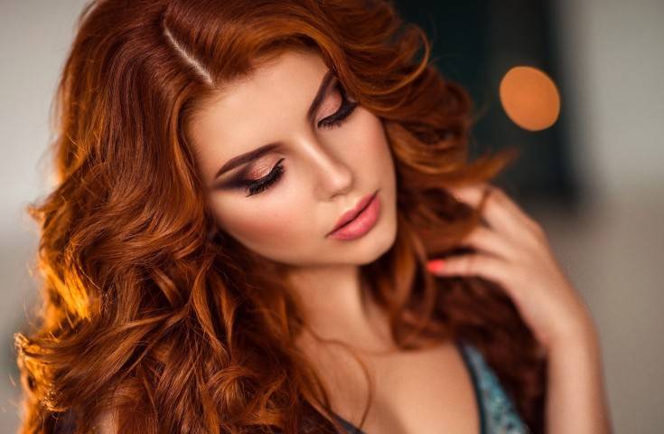Сначала поговорим о рыжеволосых женщинах, с карими глазами. Такие люди излучают свет и солнечное сияние, даже если не используют другие яркие акценты. А если правильно подобрать цветовую палитру для создания дневного макияжа, то можно усилить блеск очей и превратиться в неземную сказочную красавицу. В первую очередь нужно рассматривать теплую и нежную палитру, в песочной, зеленой и розовой гамме. Неудачным решением будут оттенки, которые идеально повторяют тон радужки или локонов. Так же нужно забыть о холодных красках: синих и бирюзовых.
