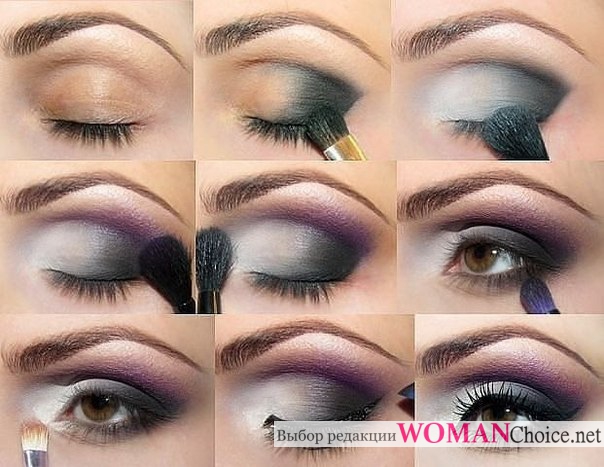 Для создания яркого и выразительного образа нужно запастись коричневыми, серебристыми, сиреневыми и золотистыми тенями. В таком мейкапе нельзя применять более трех цветов, иначе результат получится неожиданным. Причем все границы между оттенками нужно аккуратно растушевывать. Начинать как всегда необходимо со светлого и заканчивать самым темным. Для дневного выхода в свет, универсальным считается тон сливы и темного фиолетового. Так как они выгодно смотрятся как на белой так и на смуглой коже.
