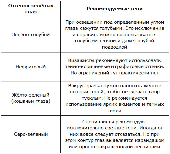 Чтобы сделать красивый вечерний макияж для зелёных глаз, воспользуйтесь следующей таблицей.