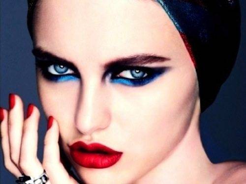 Румяна наносятся по нисходящей линии щёк. Броский макияж глаз при оттенке помады в тон кожи.