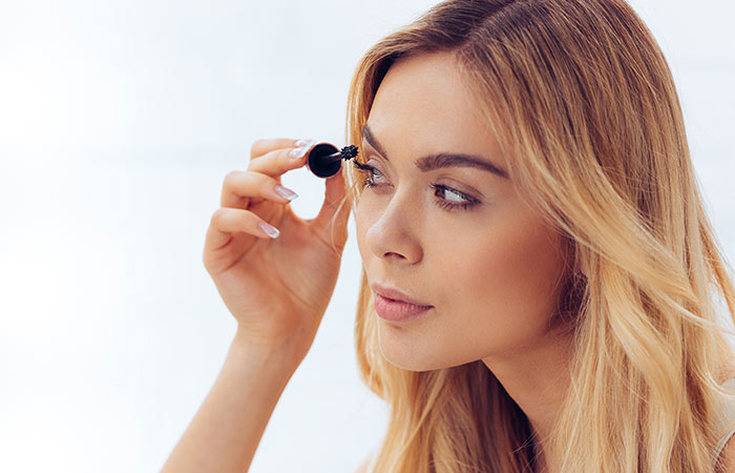 Для начала нанесите специальную основу на ресницы для придания им дополнительного удлинения, объема и драматичности. Используйте тушь, чтобы сделать взгляд распахнутым. Начните прокрашивать с основания, продвигайтесь к кончикам, пока не покроете всю длину ресниц. Для дополнительной выразительности наносите последовательно несколько слоев. Воск в составе средства создает объем и делает глаза визуально шире.