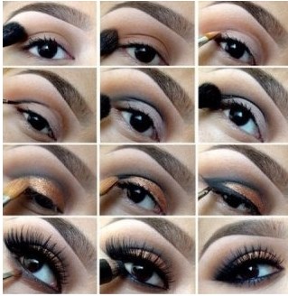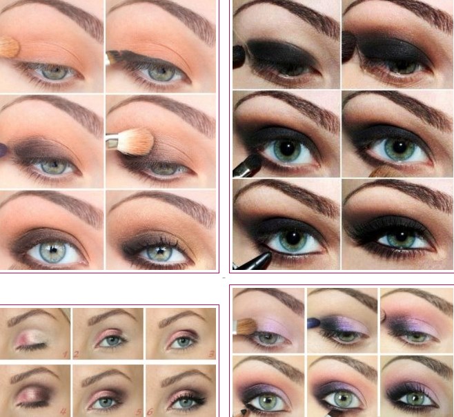 Мейкап начинают делать, нанося самые светлые тени, которые могут иметь легкий блеск. Тени наносят на верхнее веко. Используя белоснежные матовые тени, делают акцент на внутренних уголках глаз и под бровями. Если мейкап делается пошагово, то вначале можно выделить наружные уголки глаз с помощью темно-коричневого карандаша либо добавить больше теней черных цветов по наружному контуру, аккуратно растушевывая края до нечетких линий.