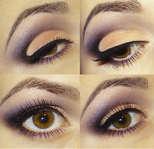 Роскошно выглядит макияж глаз с нависшим веком в синих и фиолетовых тонах. Теплый темный карий очень эффектно оттеняет холодная глубокая гамма. Существуют разные варианты нанесения, предлагаем остановиться на самом простом: