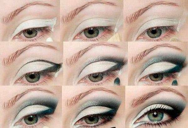 Такая техника предполагает выделение подвижной части века с помощью светлых пигментов. Закрасьте белыми или светло-серыми тенями подвижное пространство до складки нависания, а во внешний уголок глаза и в область чуть выше складки добавьте оттенок потемнее. Распределите темный пигмент и на нижнее веко, тщательно растушевывая все границы для соединения воедино верхней и нижней части.