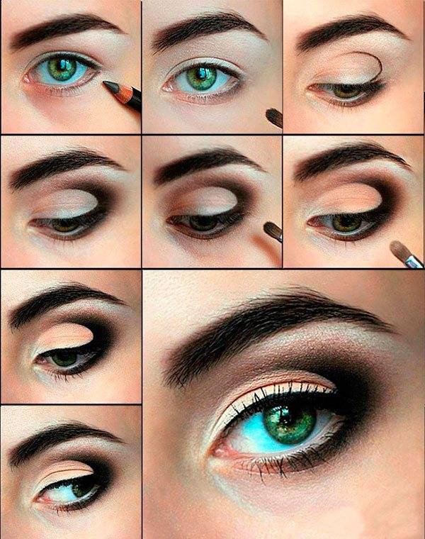 Веки подводятся по обычной схеме. Затем линии утолщаются, постепенно карандашом закрашивается все подвижное веко. Во внешних уголках глаз стрелки слегка приподнимаются, начиная с середины нижнего века проводится тонкая линия, утолщающаяся к внешнему углу. Карандашные штрихи тщательно растираются, по необходимости можно положить еще один слой. Для такого макияжа используют лайнер очень темных тонов: черный, шоколадный, бордовый, чернильно-фиолетовый.