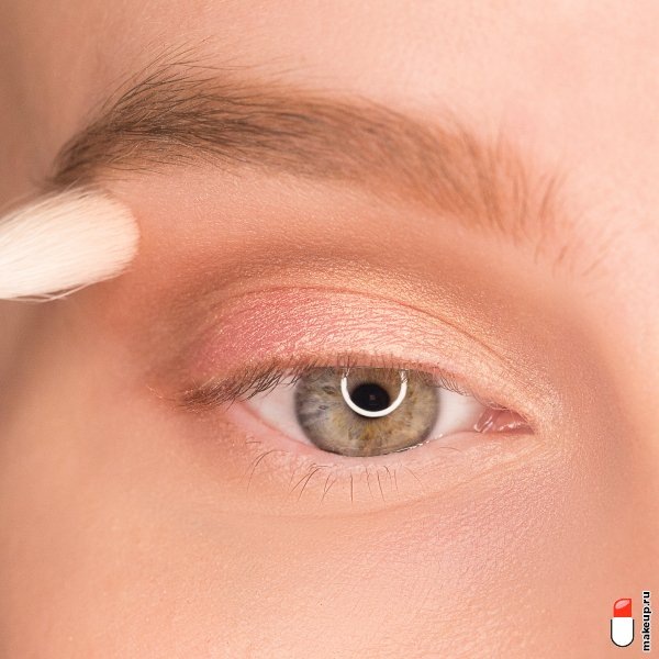 3 Светлыми матовыми или сияющими тенями заполнитель все подвижное веко. Внутренний уголок глаза и подбровное пространство подсветите хайлайтером.
