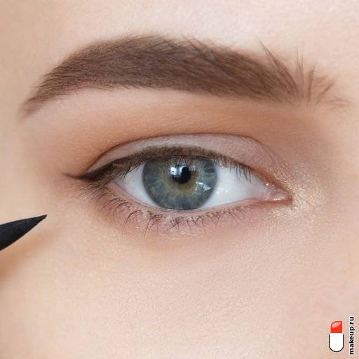 Стрелка, как и складка, рисуется непосредственно по нависанию. При открытом глазу карандашом или лайнером выводится хвостик в дальнейшем к нему будут подходит штрихи от середины века и нижней линии роста ресниц. Хвостик должен быть небольшим (особенно, если это ежедневный мейк). Также советуем пользоваться натуральными оттенками – коричневым или темным графитом;