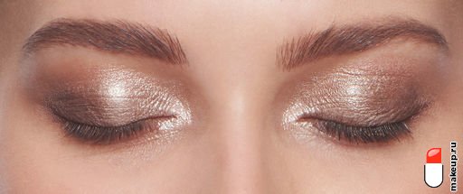 - Плоской кистью с натуральным ворсом нанесите тени, имеющие небольшой шиммер. Допустимо сочетание нескольких тонов – у внешнего уголка оставьте более темный, а у внутреннего – самый светлый. Границы теней нужно мягко растушевать. Нанесите светлые шиммеровые тени и на нижнее веко, чтобы придать взгляду сияние.