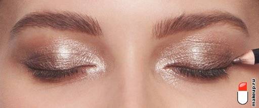 В складку верхнего века накладывают тени телесного или светло-серого цвета. Переход между оттенками не должен быть резким, а потому все границы подвергаются растушёвке. Нижнее веко с уже начерченной на нём тёмной линией окрашивают тенями светлых или телесных тонов с эффектом мерцания.