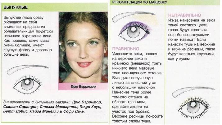 Большие выпученные глаза тоже нуждаются в коррекции. Исключительно жемчужные тени на веках добавят объем глазам, поэтому выбирайте матовые текстуры с темными пигментами. Проведите линию бровей немного дальше от внешнего уголка глаза. Подчеркнуть его желательно белым карандашом или небольшим количеством светлых теней.