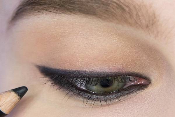 - Темно-серым карандашом проводим линию от центра глаза вдоль роста ресниц к внешнему уголку, уводя ее немного наверх и утолщая край;