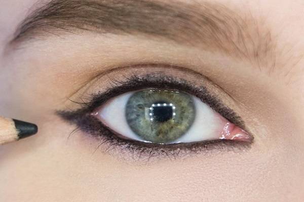 Чёрным кайалом прокрасьте слизистую глаза между ресницами и внутренний уголок.