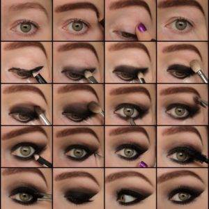 На внешний уголок подвижного века необходимо нанести темно-бежевые или коричневые тени, возможно, с добавлением перламутра. Бугорок глазного яблока на веке выделяется более темным тоном теней. Внешний край нижнего века красим аналогичным тёмным оттенком и растушевываем линию по направлению к центру глаза. На верхнем веке вдоль линии роста ресниц прорисовываем чуть удлиненную стрелку. В завершении необходимо подчеркнуть густоту ресниц.