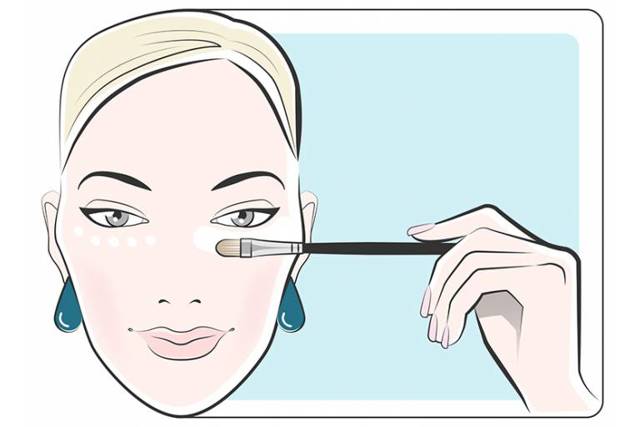 - Покройте зону под глазами, участки над верхней губой, по центру лба тональным кремом, но светлее основного тонального средства.