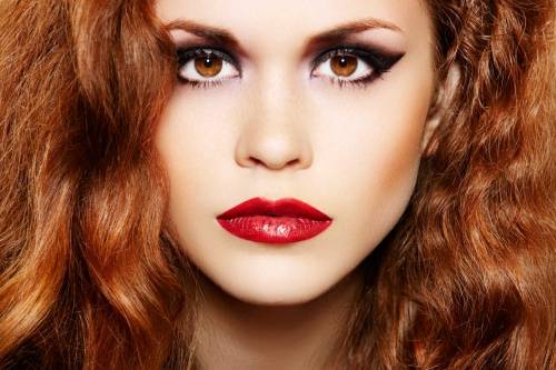 - помаду выбирают на 1-2 градуса слабее насыщенности цвета прически, хорошо подходят оранжевые, медные, нюдовые, а также оттенок чилийского перца.