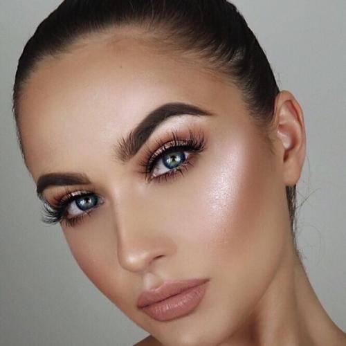 - Светящаяся кожа. Напоминает о представителях иной расы. Добавив поверх тонального крема, например, румяна со слюдой можно выделить высокую точку скул, контур верхней губы или спинку носа, а можно заставить блестеть все лицо. Темной губной помады при этом макияже избегают.