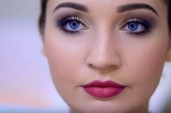 Тени можно выбирать розовые, лиловые, сиреневые, подводку – темно-серого или коричневого цвета. Макияж губ лучше выполнить, используя самые нежные розовые тона.