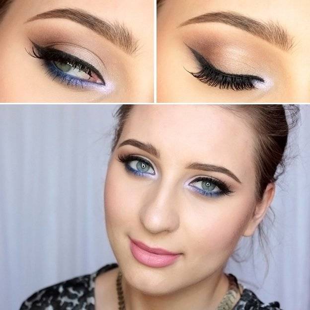 Для придания небесного тона подойдут тени холодной палитры: стальные, голубоватые, серебристые и серые. Из предложенных красок можно совершить идеальную растяжку. Накладывайте темный на внешний уголок глаза.