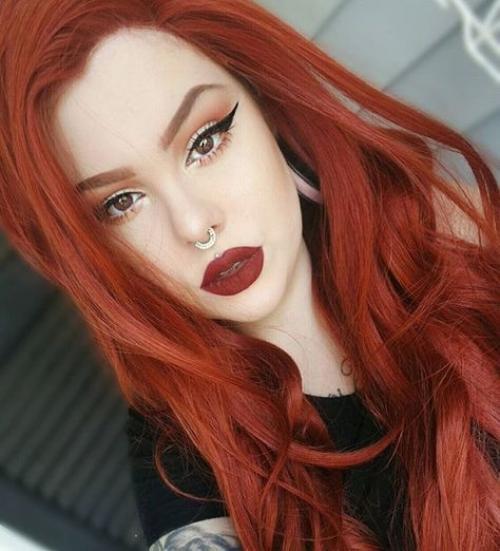Также можно выбирать красную помаду для губ соответственно твоему цвету волос — это будет создавать интересный эффект слияния оттенков.