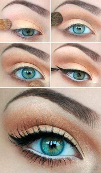 - требуется аккуратно накрасить теплые коричневые тени рыжего или золотистого оттенка на наружную третью часть большого века;