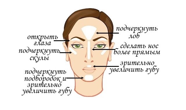 А вот середину лба, ямочку на подбородке, галочку над верхней губой, участки под глазами, спинку носа и верх скуловой кости нужно сделать светлее.