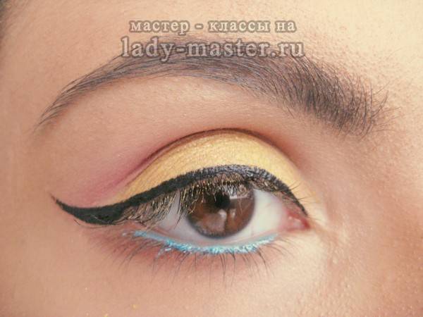Важно не прогадать с тоном: слишком бледный голубой оттенок рискует затеряться, а синий выглядит слишком вызывающе. Пока полученная смесь не застыла, тонкой полоской прорисовываем контур вдоль нижнего века