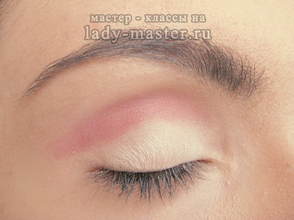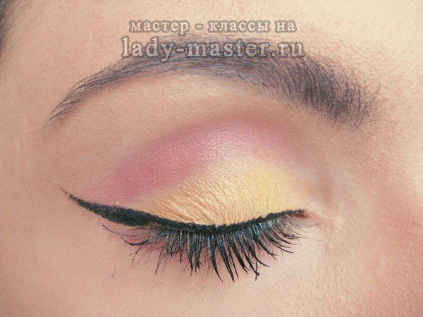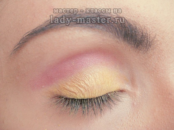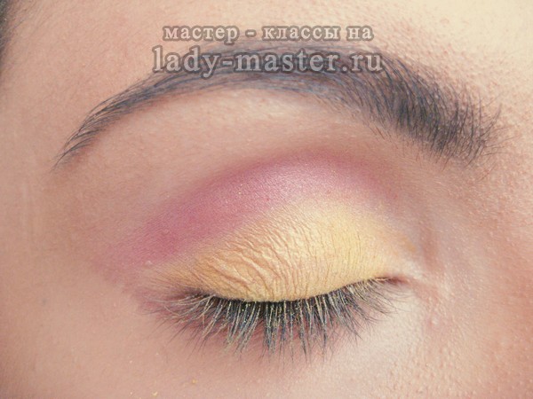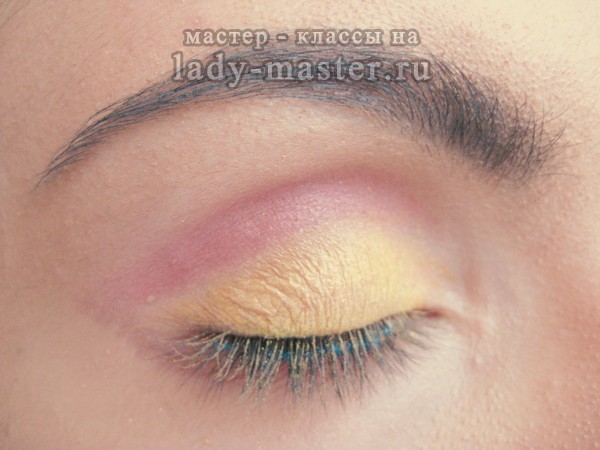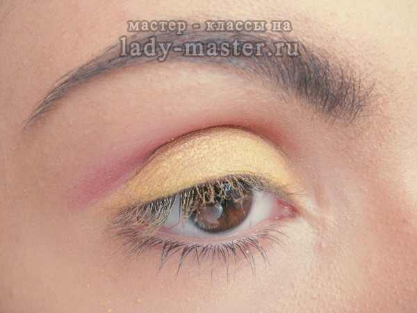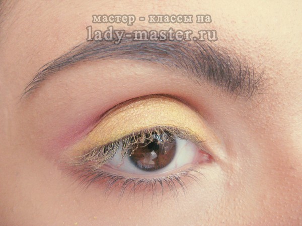 Теперь прокрашиваем середину насыщенно яичным оттенком. Следим, чтобы макияж «Латино» не оставлял прорех по соседству с участком бардо и вплотную подходил к линии роста ресниц.