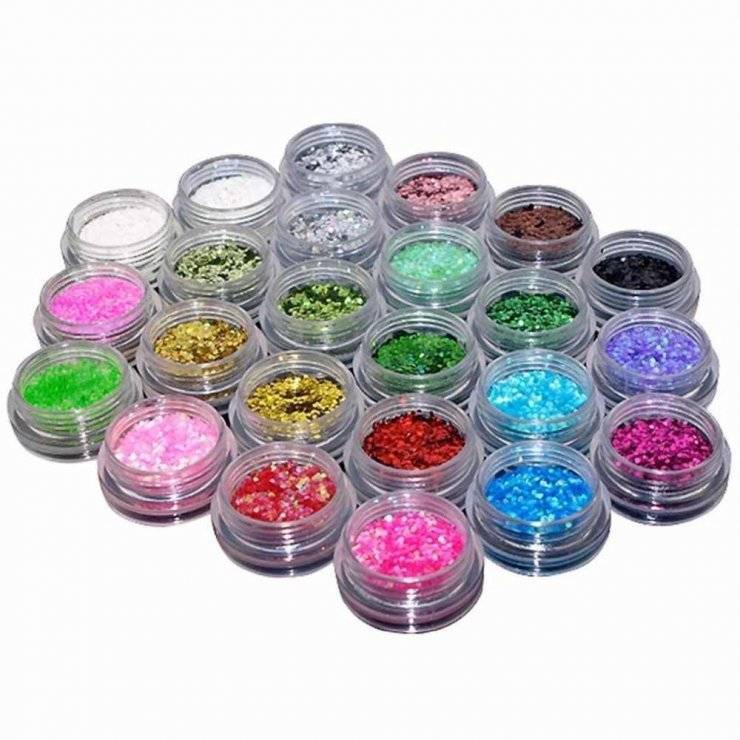 - Другие пушистой кистью наносят на нужные участки тела рассыпчатые блестки.