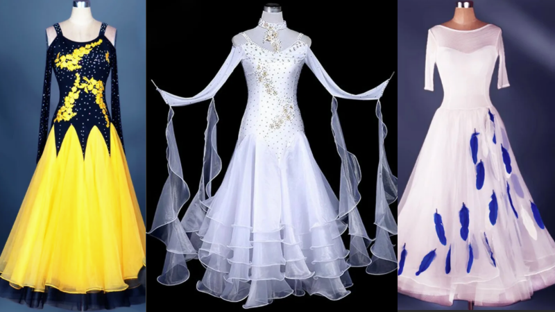 Для танцевания в этой программе потребуется совсем другое платье — длинное и достаточно закрытое. Цвета, фактуры и украшения могут быть абсолютно разными.