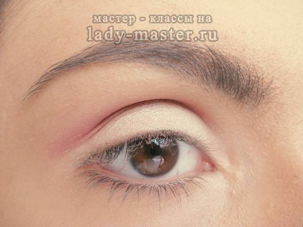 Область неподвижного века прокрашиваем узкой полоской бардового пигмента. Постарайтесь протянуть этот штрих от внутреннего к внешнему уголку века. При этом постепенно расширяйте намеченную черту – около места, где будет располагаться хвост у стрелки, она должна выглядеть максимально чётко. Помним про тщательную растушёвку границ.