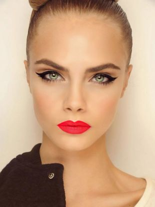 Например, у блондинок тёмные тени и выразительные алые губы будут привлекать много внимания и смотреться излишне броско, а вот у шатенок и брюнеток этот вариант будет роскошным.