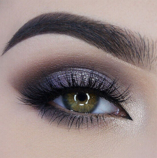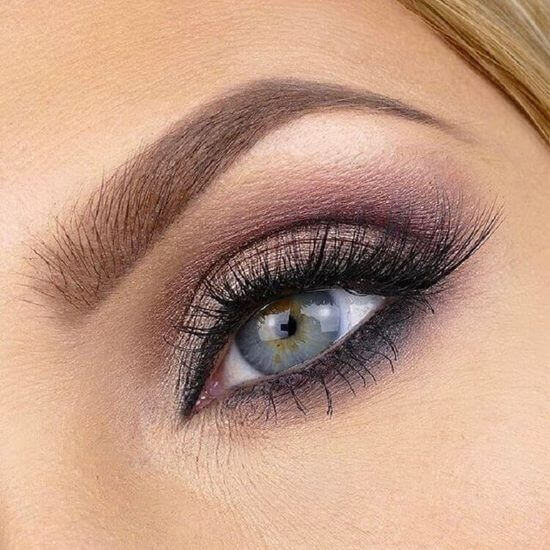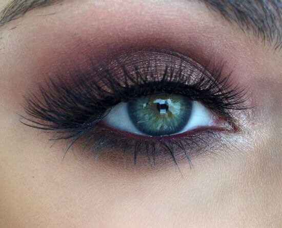 Мягкие шоколадные оттенки, тени с пурпурными и желтоватыми вкраплениями помогут превратить светло-серые очи в зеленые.
