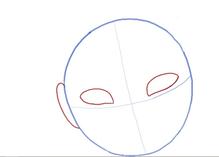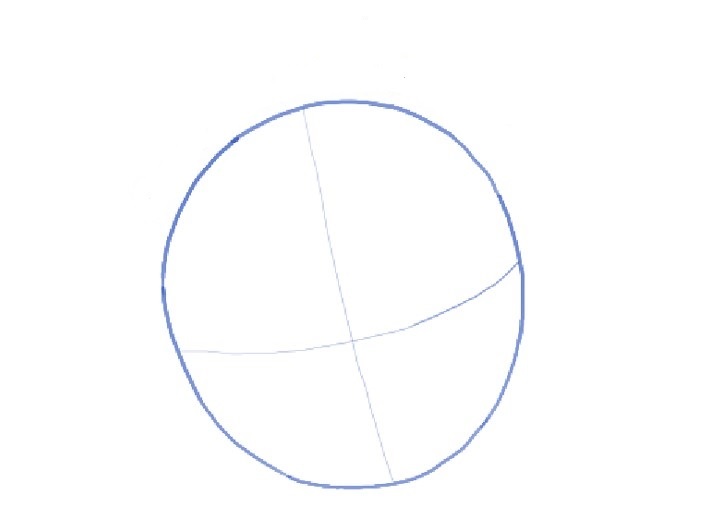 Нарисуйте овально-круговую форму, как показано ниже. Затем нарисуйте руководящие линии через него, чтобы помочь вам разместить черты лица.