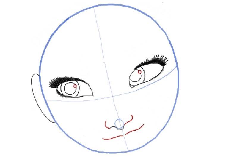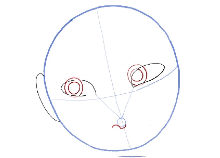 Нарисуйте направляющие вниз от глаз к центру, создавая букву “v”. В нижней части слегка нарисуйте круговую направляющую.