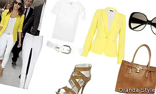 Еще один уютный, но изящный наряд от Eva Longoria показывает нам, как носить белые брюки и яркий пиджак. Беспечно закатайте рукава и наденьте всю одежду вместе с огромными квадратными солнцезащитными очками и поясом. Носите сандалии и сумку нейтрального светло-коричневого цвета, чтобы ваш желтый пиджак выглядел еще больше. Это наряд, который вы можете носить на работе или в самолете, он универсален и практичен.