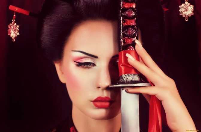 Черной подводкой очерчиваем четкую линию стрелки, стремящуюся вверх от наружного уголка глаза. Карандашом рисуем губы, напоминающие по форме цветок или бантик, наносим помаду яркого оттенка (в идеале красного) и жидкий блеск. Завершаем образ с помощью розовых румян светлых тонов. Подобный макияж в обязательном порядке следует дополнить кимоно из шелка и прической с высоко подобранными волосами.