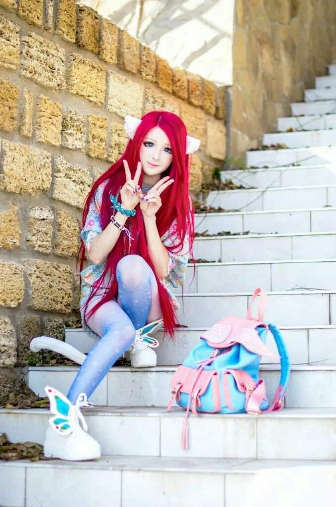 Конечно же, для того чтобы подчеркнуть образ, не обойтись без соответствующей макияжу причёски. В аниме популярны пышные причёски, при этом волосы должны быть идеально ровными. Выровнять локоны можно с помощью утюжка для волос, а придать объём, можно воспользовавшись лаком сильной фиксации. Цвет волос должен быть ярким, предпочтение отдаётся кислотным оттенкам – малиновому, рыжему, ярко-голубому. Не обязательно приносить свои волосы в жертву моде, можно одеть парик, или вплести яркие пряди в свои собственные локоны.
