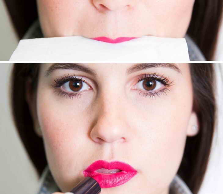 - Используйте салфетку, даже если вам не нужно убирать излишки. Так помада продержится дольше, и вы точно никак случайно её не размажете.