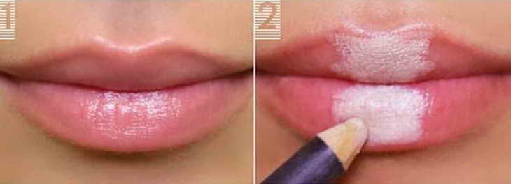 Использование помад и контурных карандашей светлых цветов дает весьма существенный визуальный эффект за счет отражения света со осветленной поверхности губ. Контур следует наносить по верхней стороне естественного контура губ, а помаду растушевывать от уголков рта к его центру.