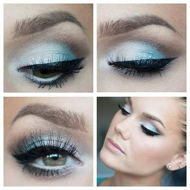 Контур глаз под зеленый и бирюзовый наряд подойдет черный или коричневый, а к синему уместно рисовать стрелки синего, черного или коричневого цвета. В мейк-апе к синему наряду доминируют светлые и переходные оттенки. Темный синий может быть использован лишь для нанесения на наружный уголок глаза или в качестве контура.
