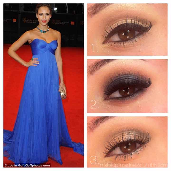 Уместно ли очертить глаза синим цветом? Тут мнения экспертов разошлись. Большинство из них утверждают, что можно вводить в макияж синие тени, но только в сочетании с серыми, бежевыми или коричневыми. Но бытует и другое мнение: лучше остановить выбор на контрастных цветах: персиковых, песочных, терракотовых, золотистых. И все же, внимательно рассмотрите фото звезд в темно-синих платьях. Они уверенно доказывают: от синей гаммы оттенков в макияже не нужно отказываться полностью!
