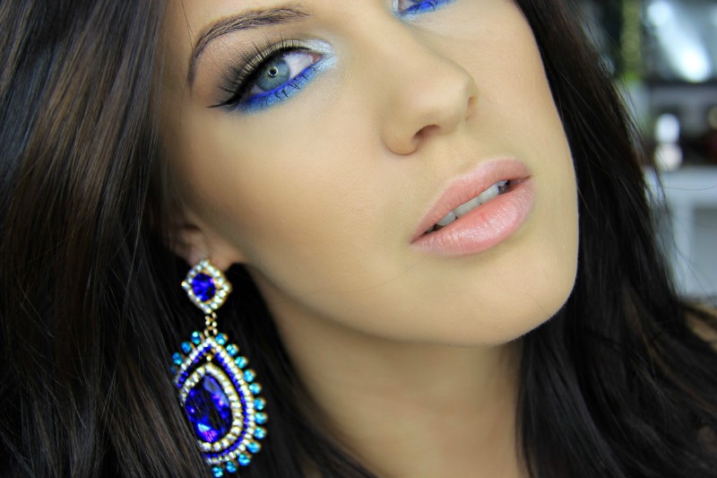 С особым шиком будет выглядеть синяя тушь, нанесенная на кончики ресниц, и слегка подведенное синими тенями или карандашом нижнее веко.