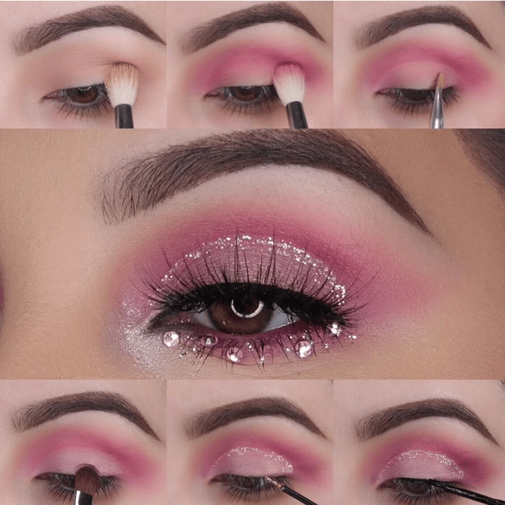 - Розовым металлик-оттенком провести границу по складке и добавить светлые тени во внутренний угол глаза.