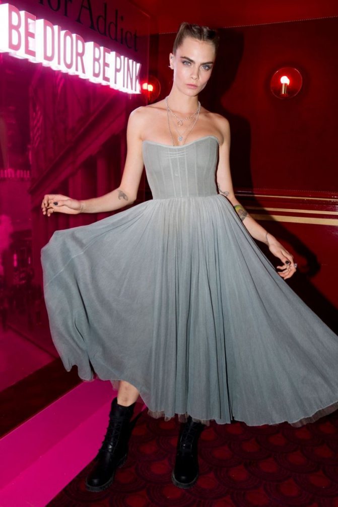 Чтобы все могли вдоволь полюбоваться ее новыми параметрами Делевинь на вечеринке Dior Addict появилась в платье-бюстье, а на показе осенне-зимней коллекции этого бренда в платье с глубоким декольте.