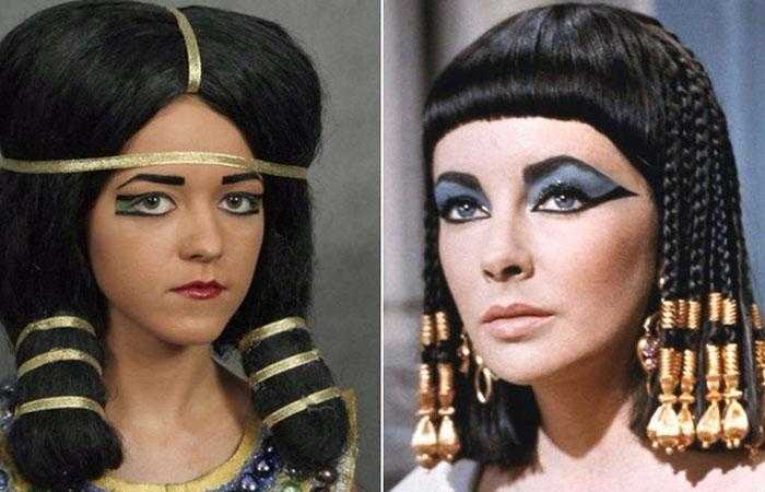 - Царица Клеопатра. Слегка подведенные глаза по ресничной линии дополняют маленькой стрелкой из угла глаза. Финальным штрихом служит линия, идущая от внутреннего угла глаза по верху верхних век, заканчивающаяся витым хвостом, параллельным прежней стрелке;