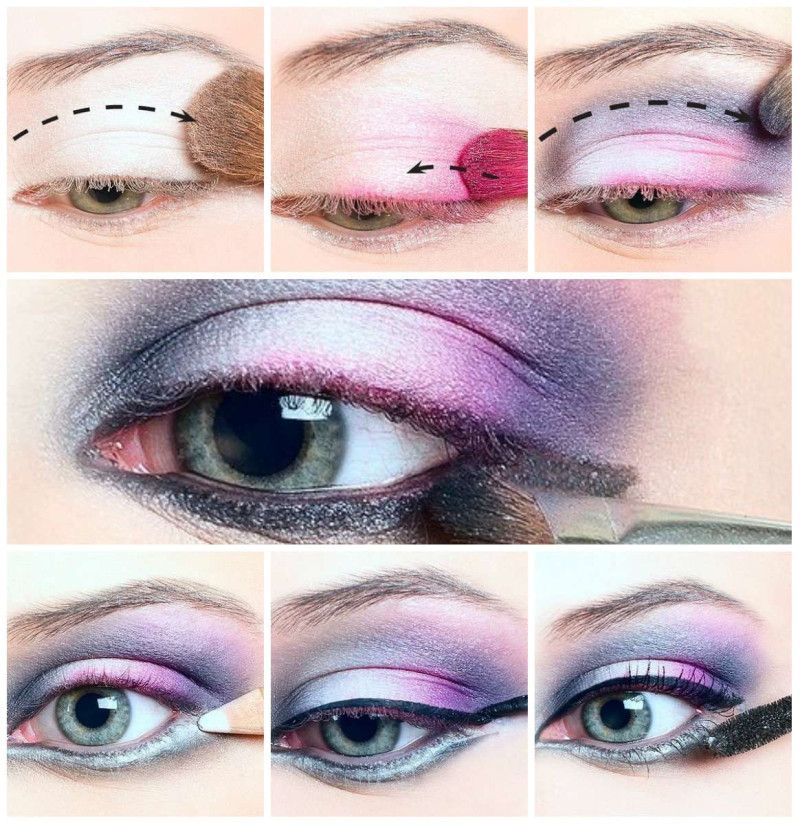 тщательно растушевываются аппликатором. Для контраста обычно используют несколько оттенков одного и того же цвета. Около основания ресниц и у внешнего уголка тон должен быть немного темнее и ярче. Например, если используются классические розовые тени, то с внешней стороны века следует нанести малиновый оттенок и сделать плавный переход. Так взгляд приобретает глубину. На внутренний угол глаза необходимо нанести немного белых или очень светлых перламутровых теней. Высветлите линию под бровью.