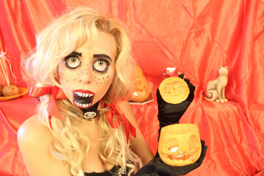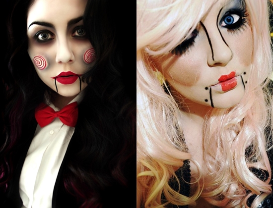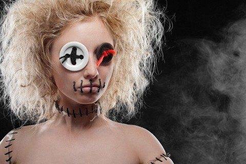 На Хэллоуин принято делать образ не милых, а пугающих кукол. Добиться такого эффекта можно при помощи использования различных средств пластического грима (создание шрамов, ссадин). Все зависит от вашей фантазии — экспериментируйте и поразите окружающих своим образом куклы на Хэллоуин!