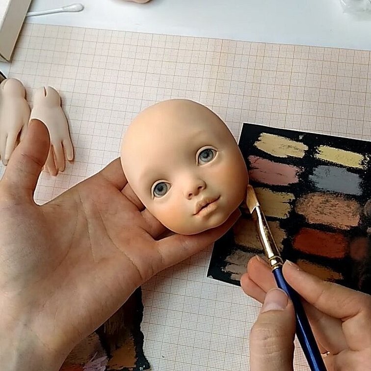 Чтобы создать образ куклы, лучше воспользоваться профессиональными акриловыми красками на водной основе. Масляные краски для рисования лица категорически не подходят, так как они вступают в реакцию с материалом, из которого изготовлена игрушка, полностью разрушая его. Получить разнообразный эффект можно при помощи глянцевых и матовых красок. Их можно смешивать между собой.