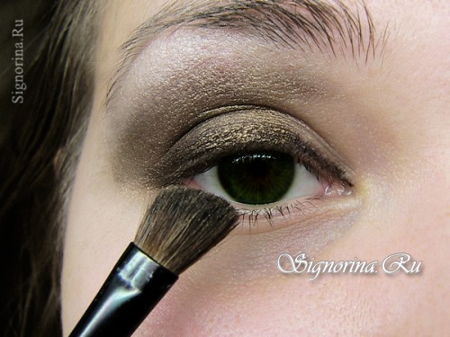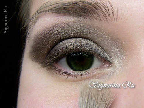 3) Зону под бровью осветляем белым перламутром. Затем переходим к тонировке века, для начала затемним внешний уголок. Тёмно-серые тени с коричнево-золотистым блеском вбивающими движениями наносим на подвижную часть (от середины к краешку).