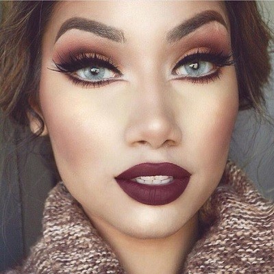 Не забывайте об акценте на губы, для чего лучше выбирать насыщенные, тёмные оттенки фиолетового, красного, карминового, коричневого. Чёрная помада, в зависимости от образа, тоже отлично подчеркнет вашу красоту.